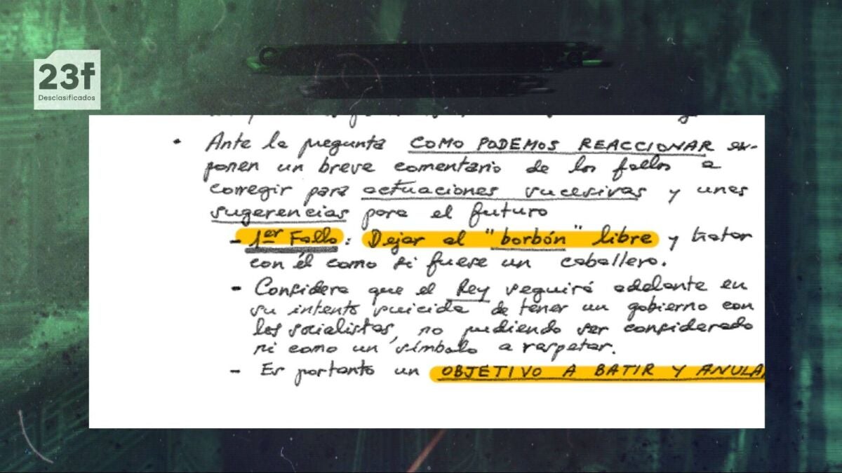Los detalles: El archivo desclasificado, escrito a mano y anónimo, detalla los errores que, según el que lo escribe, hicieron fracasar el golpe de Estado del 23F y apunta a que en "actuaciones sucesivas" habría que considerar al rey Juan Carlos I un "objetivo a batir y anular".