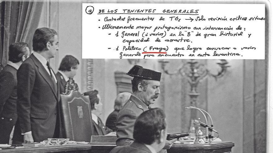 Un esquema muestra varios escenarios para tratar de terminar con el Gobierno de Adolfo Suárez. El texto, incautado por la Guardia Civil, escrito a mano y sin autoría, data de noviembre de 1980, tres meses antes de que los golpistas «expontáneos», reunidos por Antonio Tejero, entrasen armados en el Congreso de los Diputados el 23 de febrero del año siguiente, un hecho histórico que marcó la historia de una España que vivía una democracia aún incipiente. La Panorámica de operaciones en marcha recoge todas las opciones sobre la mesa: las que se inclinaban por la vía militar, la civil o las que tenían una naturaleza mixta. También quiénes ocuparían el puesto de presidente del Gobierno en cada una de la las circunstancias que se detallan pulcramente a lo largo de seis folios.