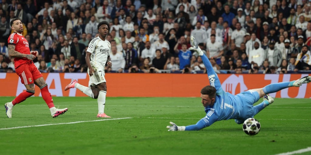El Madrid jugará los octavos de final de la Champions, pero hasta ese objetivo de mínimos llega sin la grandeza del quince veces campeón de Europa. Jugar esta repesca ante el equipo que, precisamente, te mandó a ella ya era un tachón de trazo grueso, y eliminarlo con tan poca gloria, una patada hacia delante de mal pronóstico. 2-1, con goles de Tchouaméni y Vinicius, que celebró su tranquilizador tanto en el 80 con otro bailecito similar al de Lisboa. El Benfica, aun sin Mourinho en el banquillo y sin Prestianni en el verde, se presentó en el Bernabéu con las ideas muy claras. Su primera misión era desubicar al enemigo, y eso hizo. Ganó el sorteo inicial y decidió cambiarle el orden de campo al Madrid. Para algunos, una chuminada; para Mourinho, marcar territorio. Fue un inicio de partido brillante de los lisboetas, en el que sometieron al Madrid por ambas bandas y obligaron a Courtois a hacer dos paradas. El belga se dio rápido cuenta de que, sin sus guantes, el Madrid no se iba a meter en octavos. Guantes que en el minuto 14 evitaron el gol en propia meta de Asencio, que despejó forzado un centro de Pavlidis, pero no el remate con alfombra roja de Rafa Silva, con Thibaut en el suelo tras obrar su primer milagro. 0-1. El gol del Benfica despertó por fin a un Madrid con más miedo que fútbol, y logró el 1-1 cuando aún los portugueses se quitaban la miel de la boca. Un pase al espacio de Arda a Valverde acabó en un gran centro del uruguayo, ya casi pegado a la línea de fondo, chutado magistralmente por Tchouaméni desde la frontal del área. Penalti en movimiento finiquitado con un putt 'made in Kroos'. El empate aplacó algo el ímpetu del Benfica y le dio cierta confianza a un Madrid que, subido a los hombros de Vini, intentaba cambiar la dirección de un partido con mucho riesgo. Los lisboetas son un buen equipo que, como demostraron en la fase de grupos, cuando no tienen nada que perder son descarados y tienen individualidades para darte un buen susto. Así pasó en el 37, en el segundo milagro de Courtois. Parada directa al top ten de su hoja de servicios. Y está casi imposible meterse ahí. Un disparo de Richard Ríos, que se quitó de en medio a Trent y a Güler sin ni siquiera pedir permiso, lo detuvo en la raya de gol Thibaut. Escorzo para ir al suelo y evitar el 1-2. No es inteligencia artificial. Aunque lo parezca. Cuatro minutos antes, el Madrid se había adelantado, pero la alegría duró un minuto y medio. El tiempo que tardó el VAR en avisar a Vincic de que había fuera de juego en el remate de Gonzalo previo al tanto de Güler. Fue en otra buena jugada de Vini, lo más potable de una primera mitad del Madrid que bordeaba peligrosamente la prórroga y no tenía tan lejos la eliminación. Del vestuario salió el mismo equipo poco fiable que tenía la eliminatoria en el alambre. Intentó el Madrid amasar durante más tiempo la pelota, pero arriba hacía más cosquillas que heridas. Acciones contadas de Arda y de Vinicius, y una única ocasión de Trent. En el 56, dos amagos, primero a la derecha y luego a la izquierda, y derechazo cercano al palo de Trubin. Un oasis en un Bernabéu silenciado por la ruidosa hinchada lisboeta y un tanto enfadada con otra 'performance' de su equipo que quitaba años de vida. Ni siquiera los pitos hicieron clic. Tampoco el travesaño de Rafa Silva, que con el exterior la puso en la madera en el 60. Disparo muy estético que cogió un vuelo envenenado tras golpear ligeramente el pie de Asencio. Precisamente Asencio se fue en camilla y con collarín en el 77. Un choque de cabezas contra Camavinga y una caída a plomo, boca abajo, dejó K.O. al canario, que estuvo cuatro minutos siendo atendido antes de irse a los vestuarios. Acabó en el hospital pasando pruebas. El parón precedió al tanto de Vinicius que acabó con el tembleque de las piernas. Un balón dividido en el centro del campo lo cogió Valverde y lo puso para que el brasileño, ante un Benfica volcado y con Otamendi fuera de la marca, corriera solo ante Trubin y le batiera con un sutil golpeo con la derecha. El Madrid, sin lustre, pero en octavos.