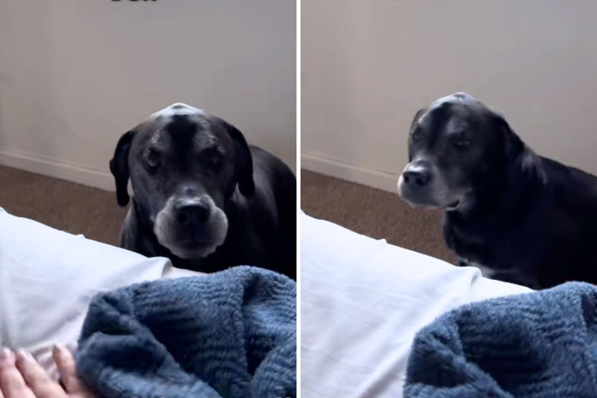 The 9-year-old dog will whine for help getting onto the bed, but the pet camera shows a different story when he's home alone.