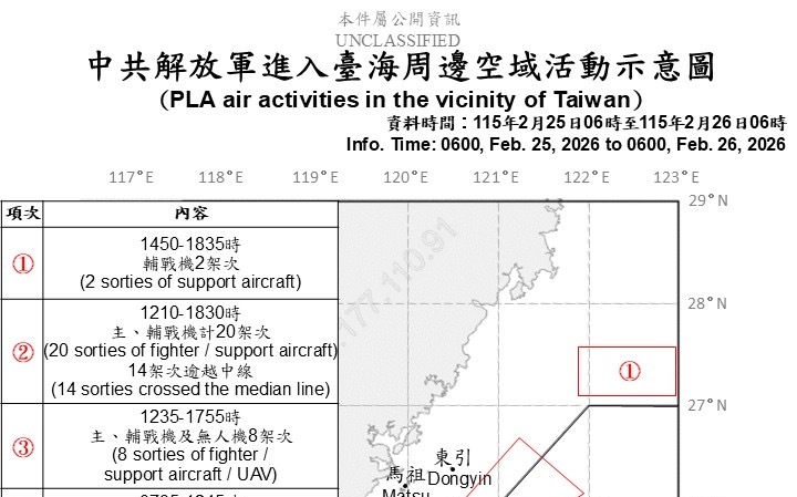 Newtalk新聞 國防部今(26)日公布中共解放軍最新動態指出,自昨(25日)晚間,中共以「聯合戰備警巡」之名,對我周邊空、海域進行高強度騷擾行動,不僅並非演習,且共機活動距離明顯逼近我領海方向,國軍全程嚴密監控並即時應處。 根據國防部今早發布資料,自2月25日清晨6時起至26日清晨6時止,共偵獲中共各型軍機30架次、共艦6艘持續在台海周邊活動,其中22架次軍機逾越台灣海峽中線及其延伸線,進入我北部、中部及西南空域,對我空防構成實質壓力。 國防部指出,相關行動並非單一時段突發狀況。昨(25)日稍早,國防部亦於18時30分發布新聞稿說明,自當日12時36分起,陸續偵獲殲-10、殲-16、空警-500等主、輔戰機及無人機共28架次出海活動,其中同樣有22架次逾越中線及其延伸線,進入我北部、中部及西南空域,並與共艦配合,假借「聯合戰備警巡」名義,對我周邊空、海域進行騷擾。 除軍機、軍艦外,國防部同步揭露,期間亦偵獲2顆中共空飄氣球穿越中線活動。其中一顆於基隆西方約87浬處出現,高度約1萬3千呎;另一顆則於台中西北方約48浬處出現,高度更達2萬6千呎,相關航跡顯示,其活動範圍更跨越台灣本島上空。 國防部強調,面對中共持續以非演習名義,卻採取準軍事行動方式進逼我周邊空、海域,國軍運用聯合情監偵手段全程掌握動態,並依狀況檢派任務機、艦及岸置飛彈系統,實施適切應處,確保國家安全與區域穩定。 延伸閱讀: 共軍「聯合戰備警巡」擾台成常態、近1個月已有4波 台股開盤》大盤紅翻黑 分析師:留意盤後「一事」 尾盤恐震盪 童振源專論》沒有 EUV 的突圍戰:中國能否改寫先進製程版圖? 專家看盤》台股量縮再創高!輝達財報助攻 低檔補漲名單來了 「國安防線絕無模糊空間」汪浩籲行政部門硬起來阻止李貞秀當立委