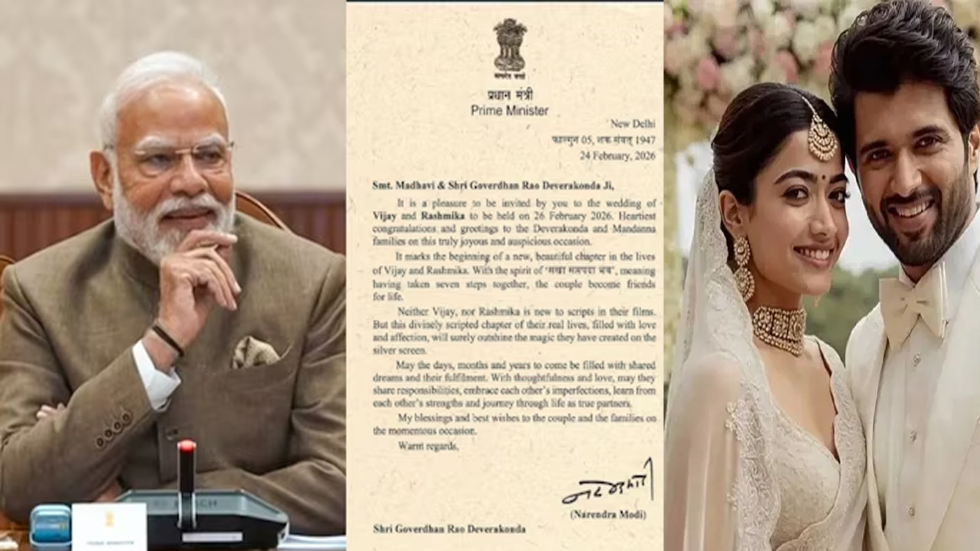 অগণিত ভক্তের কৌতূহলের অবসান ঘটিয়ে দক্ষিণি সিনেমার দুই জনপ্রিয় মুখ বিজয় দেবেরাকোন্ডা ও রাশ্মিকা বিয়ে করছেন। সামাজিক যোগাযোগমাধ্যমে ‘দ্য ওয়েডিং অব বিরোশ’ নাম দিয়ে ঘোষণা দিয়েছেন তারা। আজ (২৬ ফেব্রুয়ারি) রাজস্থানের উদয়পুরে এক রাজকীয় অনুষ্ঠানের মাধ্যমে বিবাহবন্ধনে আবদ্ধ হতে চলেছেন। তাদের বিয়েতে শুভেচ্ছা জানিয়েছেন ভারতের প্রধানমন্ত্রী নরেন্দ্র মোদী।চিঠিতে মোদি লিখেছেন, বিজয় ও রাশমিকার বিয়ের আমন্ত্রণ পেয়ে আমি অত্যন্ত আনন্দিত ও সম্মানিত। দেবেরাকোন্ডা এবং মান্দানা পরিবারকে এই অত্যন্ত আনন্দময় ও শুভ অনুষ্ঠানের জন্য আমার আন্তরিক অভিনন্দন ও শুভেচ্ছা জানাচ্ছি।তিনি আরও লিখেন, এটি বিজয় এবং রাশমিকার জীবনের একটি নতুন, সুন্দর অধ্যায়ের সূচনা করে। সখা সপ্তপদ ভাবের চেতনায়, অর্থাৎ সাত ধাপ একসঙ্গে এগিয়ে যাওয়ার পর, এই দম্পতি সারা জীবনের জন্য বন্ধু হয়ে ওঠে। বিজয় বা রাশমিকার কেউই তাদের চলচ্চিত্রের জগতে নতুন নন। কিন্তু তাদের বাস্তব জীবনের এই ঐশ্বরিকভাবে রচিত অধ্যায়, প্রেম এবং স্নেহে ভরা, অবশ্যই রূপালী পর্দায় তাদের তৈরি জাদুকে ছাড়িয়ে যাবে। আরও পড়ুন: বিজয়-রাশমিকার বিয়েতে খাবার পরিবেশন হবে কলাপাতায়সবশেষে চিঠিতে লেখা ছিল, আগামী দিন, মাস এবং বছরগুলো ভাগাভাগি করা স্বপ্ন এবং তাদের পরিপূর্ণতায় ভরে উঠুক। চিন্তাশীলতা এবং ভালোবাসারসঙ্গে, তারা দায়িত্ব ভাগ করে নেবে, একে অপরের অপূর্ণতাগুলিকে আলিঙ্গন করবে, একে অপরের শক্তি থেকে শিখবে এবং সত্যিকারের অংশীদার হিসেবে জীবনের মধ্য দিয়ে যাত্রা করবে। এই গুরুত্বপূর্ণ অনুষ্ঠানে দম্পতি এবং পরিবারের প্রতি আমার আশীর্বাদ এবং শুভকামনা। আরও পড়ুন: বিয়ের খবরে সিলমোহর দিলেন বিজয়-রাশমিকাআজ বৃহস্পতিবার (২৬ ফেব্রুয়ারি) রাজস্থানের ঐতিহাসিক শহর উদয়পুর-এ ঘনিষ্ঠ পরিসরে অনুষ্ঠিত হবে মূল বিয়ের আনুষ্ঠানিকতা। উপস্থিত থাকবেন দুই পরিবারের সদস্য ও ঘনিষ্ঠ বন্ধুরা। ঐতিহ্য আর তারকাখ্যাতির মেলবন্ধনে ‘দ্য ওয়েডিং অব বিরোশ’ এখন বিনোদন অঙ্গনের সবচেয়ে আলোচিত আয়োজন। এখন ভক্তদের অপেক্ষা রাজকীয় সেই বিয়ের মুহূর্তগুলোর জন্য।