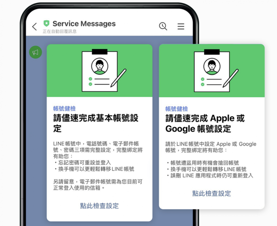 LINE 官方今日起預告,將發送新一波的帳號綁定宣導,尚未完成的用戶會收到來自於「Service Messages」綠盾官方帳號的提醒,最好盡快依照指示完成相關設定,以免後續好友名單、聊天記錄因故全消失。…