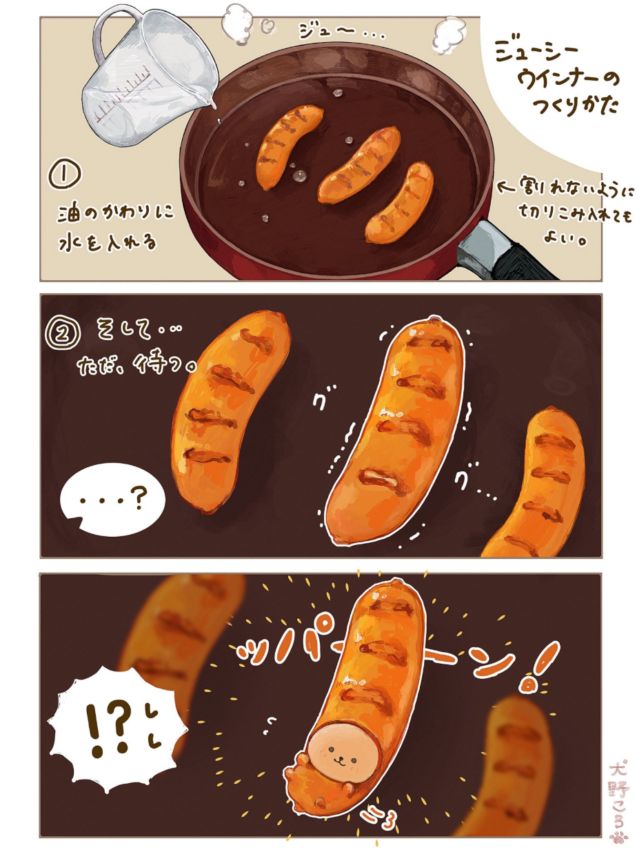 ジューシーウインナーの作り方をコミカルに描いた様ミニ漫画がXで話題になっています。 投稿したのは、犬野ころ(@inuno_kor0)さん。「⚠️ウインナーの破裂には注意してください」として、「ジューシーウインナーのつくりかた」と題した3コマ漫画を投稿しました。 この投稿は6000回以上「いいね!」され、大きな反響を呼んでいます。 イラストでは、ウインナーが割れないように切り込みを入れた部分から謎の生命体が誕生するところ様子が描かれています。 投稿主によると、「ウインナーの着ぐるみを着ているような謎の生命体のように見え、面白い」という理由から、ウインナーの弾けた部分に顔を描いたそうです。 投稿には「あれーーーーーーっ?!可愛い!!!」「ウインナーさん、弾けて顔にだいぶしてきそう?」「発想かわいすぎます✨」といったコメントが寄せられました。 投稿主は、そのような反響に対して、次のようにコメントしています。 「予想以上に多くの方に見ていただき、引用コメントなども楽しく拝見しています。最初は変わったキャラクターなので共感していただけるか不安もありましたが、『おもしろい』『可愛い』と言っていただけることが多く、とても励みになっています。今後もウインナーのんなーさんのマンガを描き続けていく予定です」 【イラスト】 謎...でも可愛い生命体 【あわせて読みたい】 赤ちゃんの口の形、何かに似ていると思ったら⇨「ほんまやw」「面白すぎる」と大爆笑 Related... 【画像】ジューシーウインナーを作っていたら…⇒破裂後まさか展開に。発想が可愛すぎると話題に メロンパンで作った“たまごっち”の人気キャラ⇨「リアルすぎる」「手作り感がジワる」と反響 あくびする愛犬の舌を連写したら…⇒ミラクルショットに「ペロペロキャンディ」「三半規管」の声 ...クリックして全文を読む