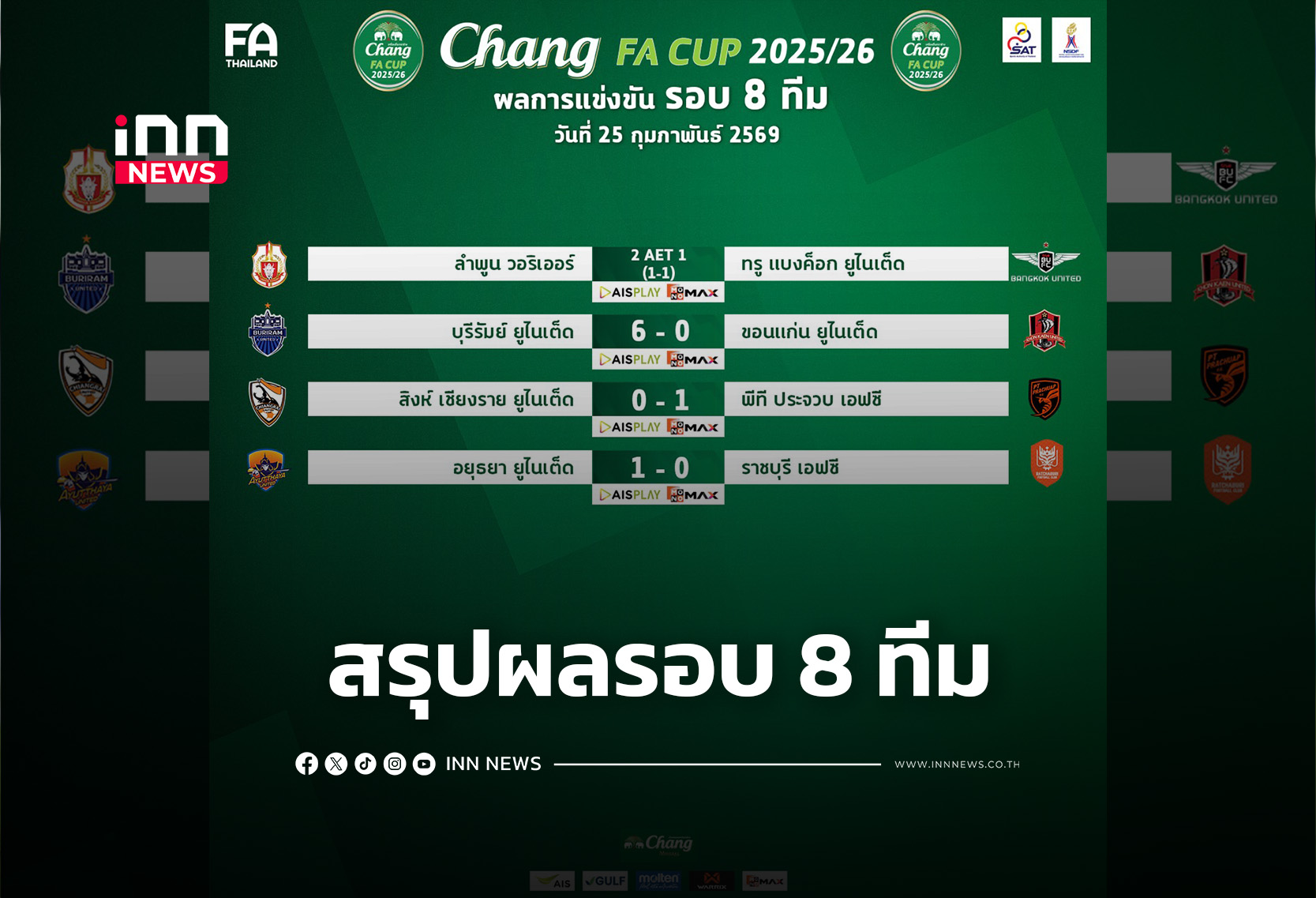 สรุปผลฟุตบอลถ้วย “ช้าง เอฟเอ คัพ” ฤดูกาล 2025/26 รอบ 8 ทีมสุดท้าย (วันที่ 25 กุมภาพันธ์ 2569)