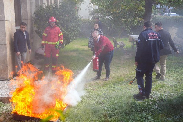 Fethiye Ticaret ve Sanayi Odası’nda (FTSO) iş sağlığı ve güvenliği çalışmaları kapsamında ‘Yangına İlk Müdahale Eğitimi’ gerçekleştirildi. FTSO çalışanlarının katıldığı eğitimde yangın söndürme tüpleri kullanılarak suni alevlere müdahale edildi.