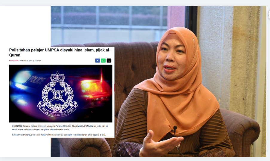KUALA LUMPUR, 26 Feb – Pengarah Sekretariat Mahasiswa Anak Pahang, Datuk Seri Shahaniza Shamsuddin kesal dengan tindakan seorang pelajar Universiti Malaysia Pahang Al-Sultan Abdullah (UMPSA) yang mencemarkan kesucian Al-Quran. Beliau yang juga Ahli Majlis Kerja Tertinggi UMNO berkata sebagai sebuah organisasi yang mewakili suara mahasiswa di negeri Pahang, pihaknya menegaskan bahawa sebarang bentuk penghinaan terhadap agama, kaum dan institusi merupakan [...]