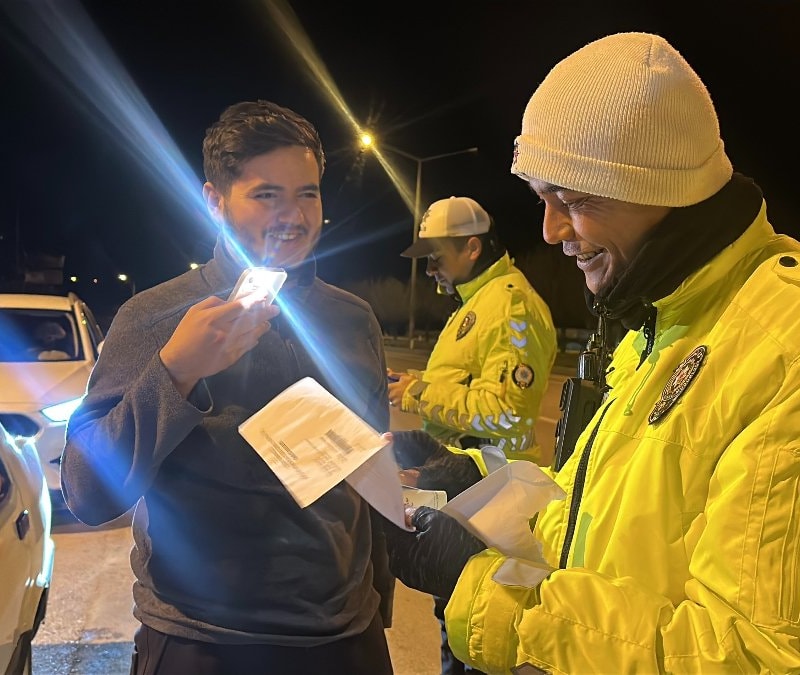 Polis uygulaması noktasında durdurulan 20 yaşındaki genç, 1 ay önce aldığı ehliyetini zarfından çıkartmak için çevirmeyi beklediğini söyleyerek polis memurlarını gülümsetti.