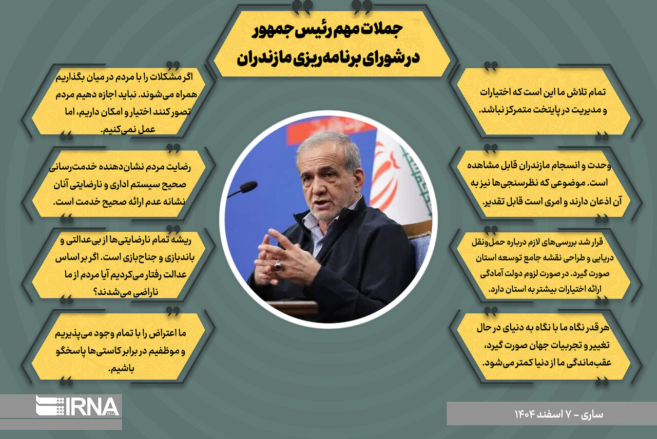 ساری- ایرنا- «مسعود پزشکیان» رئیس جمهور امروز -پنجشنبه- در دومین روز سفر استانی به مازندران در نشست شورای برنامهریزی و توسعه این استان، ریشه همه نارضایتیها را از بیعدالتی و باندبازیها دانست و تاکید کرد که نارضایتی مردم نشانه درست انجام نشدن خدمتگذاری است. بخشی از جملات مهم رئیسجمهور در این نشست را در این اینفوگرافیک میخوانید.