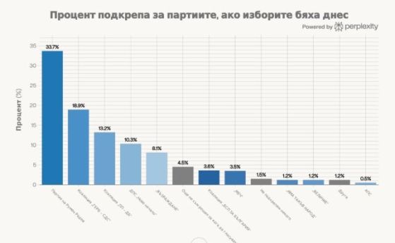 Социологическо изследване на Центъра за анализи и маркетинг (ЦАМ) от февруари показва, че българите ще изпратят пет партии в следващия парламент. Това са партията на Румен Радев, ГЕРБ, ПП-ДБ, ДСП-Ново начало и "Възраждане". Проучването е проведено на 17-24 февруари сред 1010 пълнолетни граждани чрез пряко стандартизирано интервю по домовете на анкетираните и е финансирано от ЦАМ. Ако изборите бяха днес, за партия на Румен Радев биха дали гласа си 33,7% от заявилите готовност да гласуват (и 17% с