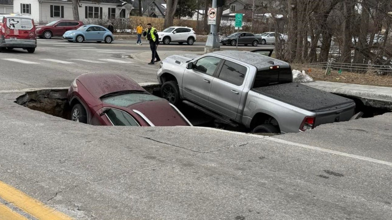 ABD'nin Nebraska eyaletinde kırmızı ışıkta bekleyen iki araç, yolun aniden çökmesiyle oluşan çukura gömüldü.