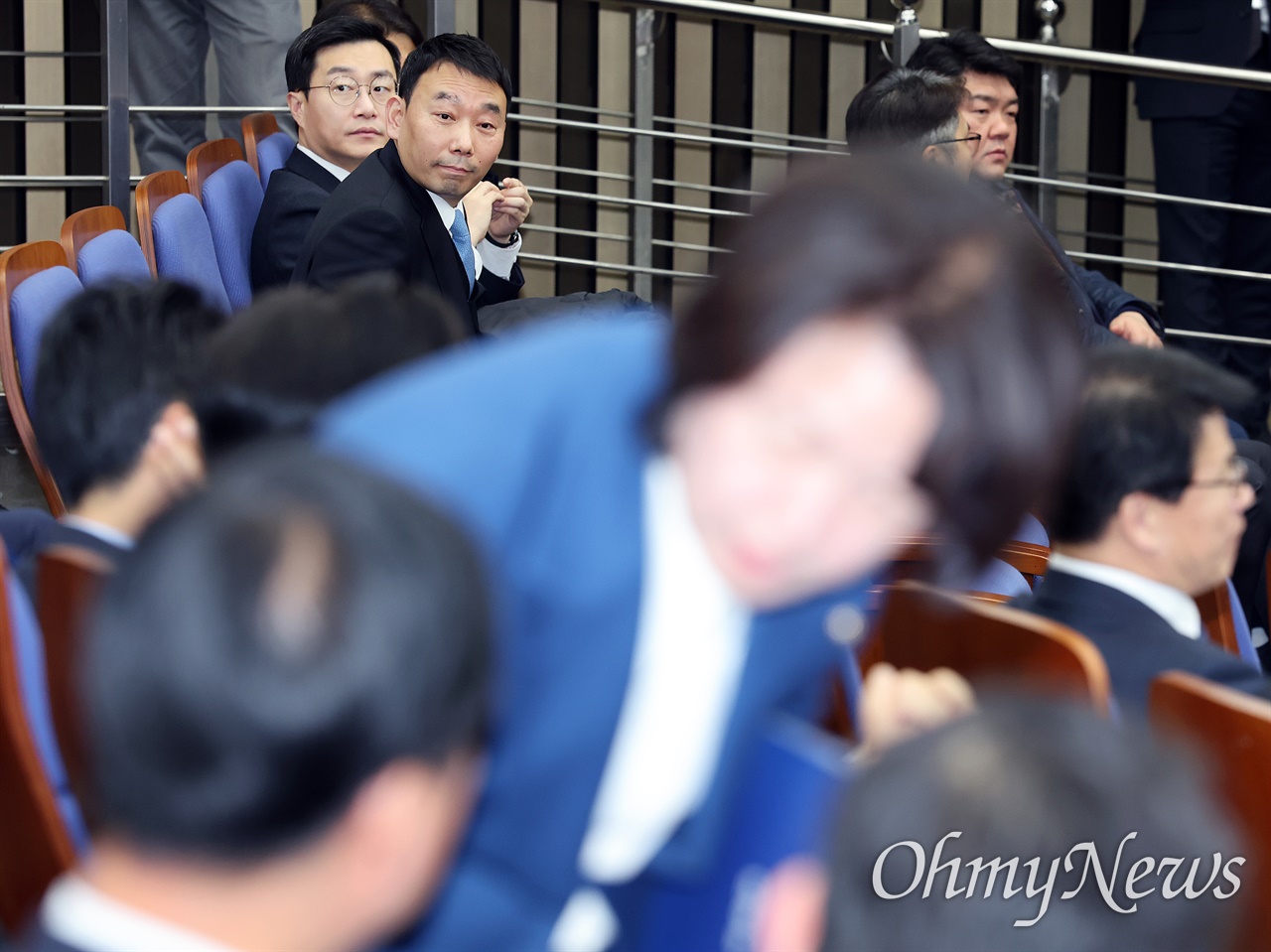 국회 법제사법위원회(법사위)를 통과해 본회의에 올랐던 법왜곡죄와 관련해 당이 수정안을 다시 낸 것에 대해 문제를 제기한 더불어민주당 간사 김용민 의원(왼쪽)이 26일 서울 여의도 국회에서 열린 의원총회에 장경태 의원과 나란히 참석해 있다. 김 의원은 이날 "당의 주요 정책은 의총에서 토론하고 바꿀 수 있지만, 그 과정에서 해당 상임위를 존중해서 해당 상임위랑 충분히 소통해 같이 만들거나 동의할 수 있는 수준으로 만들어야 한다"라면서 "어제 법왜곡죄는 저희랑 상의가 없었다"라고 강조했다. 그는 "동의를 하고 하지 않고가 문제가 아니라 의견을 제시할 기회가 있어야 하는데 그게 박탈된 상황에서 매우 기습적으로 처리가 됐다"라고 강하게 비판했다. 이들 앞 파란색 옷 입은 이는 법제사법위원장인 추미애 의원. 전체 내용보기
