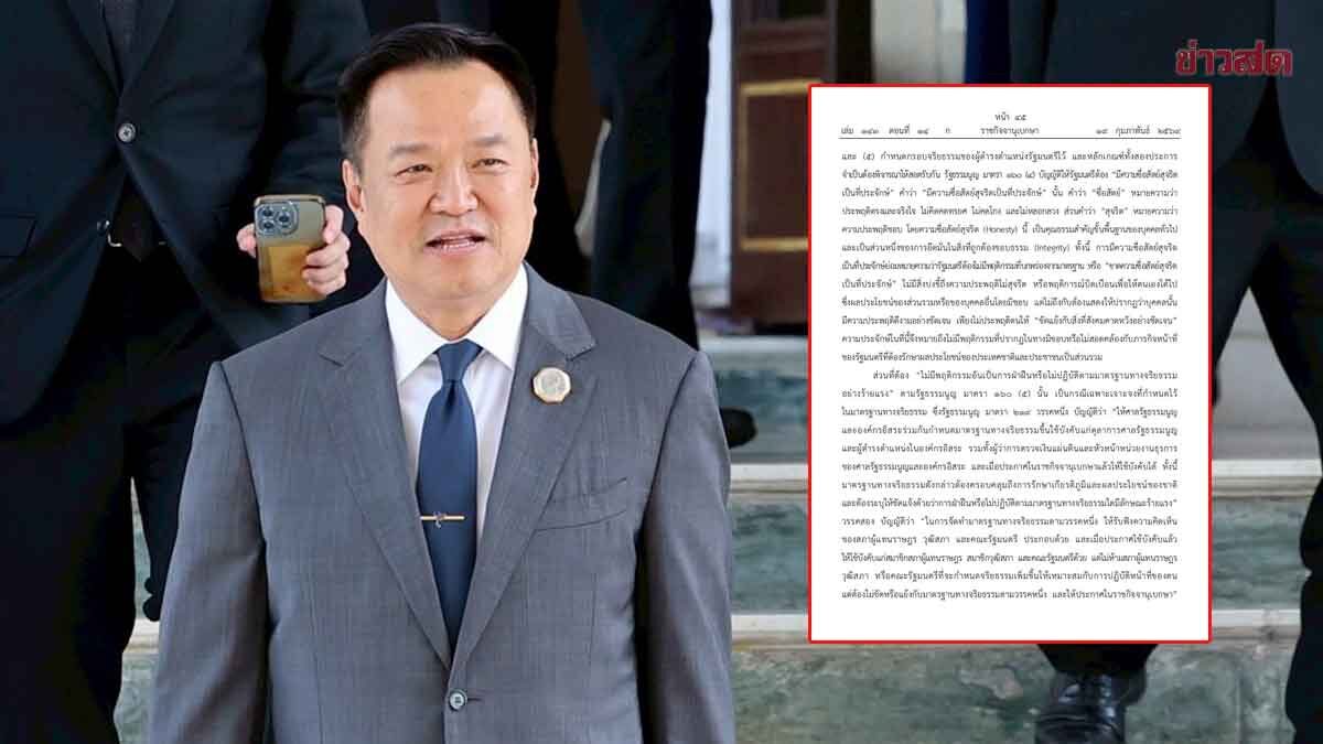 อนุทิน วางหลักตั้ง ครม.ใหม่ รมต.ต้องซื่อสัตย์สุจริตเป็นที่ประจักษ์ ต้องไร้มลทิน ไม่ขัดผลประโยชน์ชาติ ไม่คิดทรยศ ประพฤติตนขัดแย้ง หลังศาล รธน. วางบรรทัดฐานผ่านคดี “ภูมิธรรม-ทวี” เมื่อวันที่ 26 ก.พ.2569 แหล่งข่าวจากทำเนียบรัฐบาลแจ้งว่า ภายหลังนายอนุทิน ชาญวีรกูล นายกรัฐมนตรี และรมว.มหาดไทย ในฐานะหัวหน้าพรรคภูมิใจไทย จะตั้งคณะรัฐมนตรีชุดใหม่ หรือ อนุทิน 2 จะต้อง “เข้มข้นกว่าเดิมเยอะเลย” สำหรับคำว่า “เข้มข้นกว่าเดิมเยอะเลย” นายอนุทินจะยึดคำวินิจฉัยคดี นายภูมิธรรม เวชยชัย อดีตรองนายกรัฐมนตรีและรมว.กลาโหม และพ.ต.อ.ทวี สอดส่อง อดีตรมว.ยุติธรรม แทรกแซงการเลือกตั้ง สว. โดยศาลได้วินิจฉัยว่า ความเป็นรัฐมนตรีของผู้ถูกร้องทั้งสอง ไม่สิ้นสุด แต่ได้นำมาเป็นกรอบ และหลักการในการแต่งตั้ง ครม.ชุดใหม่ และได้ประกาศในราชกิจจานุเบกษา หน้า 45 เมื่อวันที่ 19 ก.พ.ที่ผ่านมา โดย ศาลรัฐธรรมนูญวางหลักการสำคัญในมาตรา 160 (4) บัญญัติให้รัฐมนตรีต้อง […]