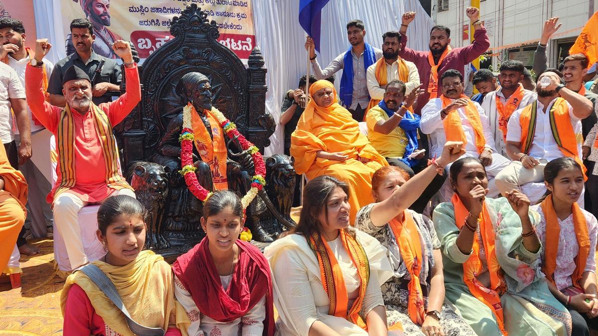 Members of various organisations, mainly Hindutva outfits, take part in the protest organised at Ambedkar Circle