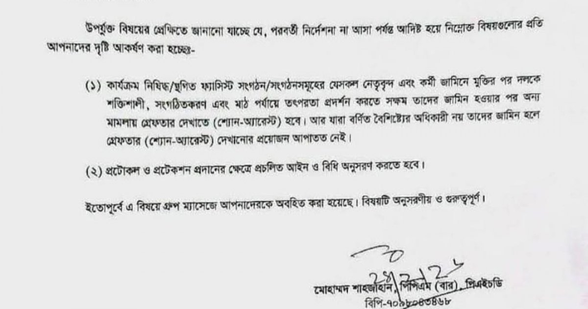 According to the letter, individuals affiliated with banned or suspended organizations who obtain bail but are deemed capable of reorganizing, strengthening or mobilizing such groups at the field level should be shown re-arrested in other pending cases Details
