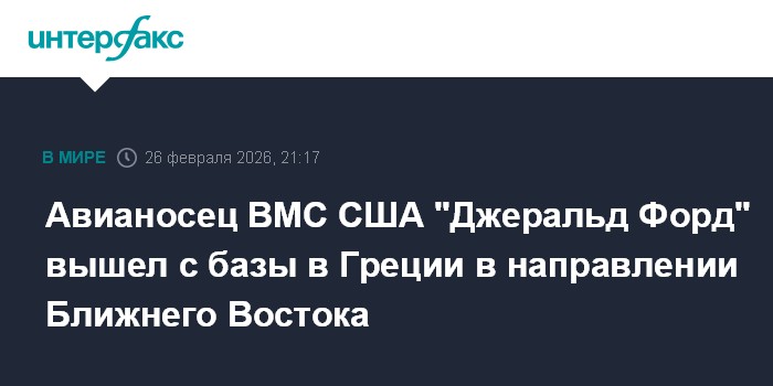 Американский авианосец USS Gerald R. Ford в четверг покинул базу Суда на греческом острове Крит, где он находился с понедельника, взяв курс на Ближний Восток, сообщил местный новостной сайт Kriti360.