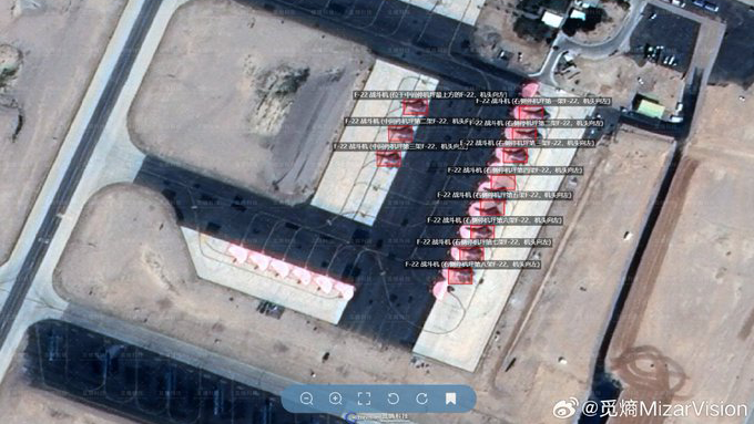 החברה הסינית MizarVision מספקת באופן קבוע צילומי לוויין מאזורים חשובים אסטרטגית, ולאחרונה מפרסמת פעם אחר פעם על תנועת הכוחות האמריקניים - גם בישראל. לצד תיעודים ברזולוציה גבוהה של מתקנים צבאיים, בחברה הסינית גם מציינים את הכמויות והדגמים של המטוסים, וכן את פריסת מערכות ההגנה