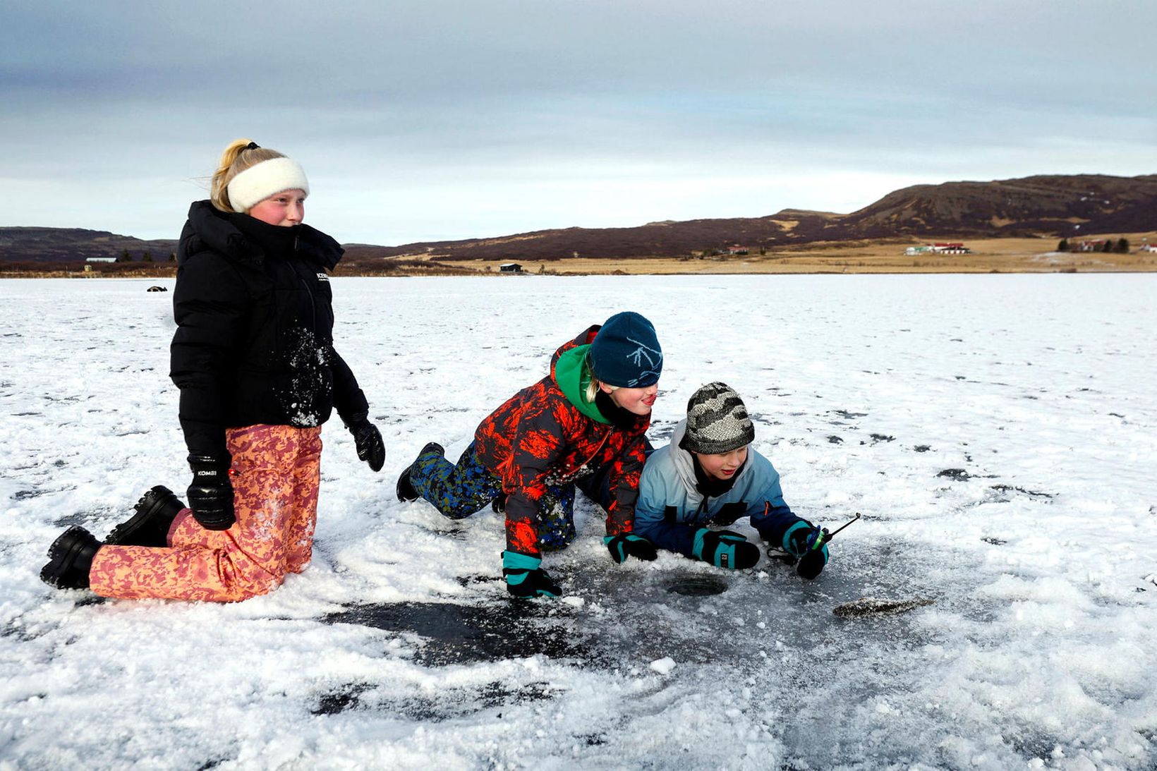 Fjölskyldufólk og ökumenn ýmissa tækja komu saman á ísilögðu Skorradalsvatni í Borgarfirði á sunnudaginn og styttu sér þar stundir við ólíka iðju, akstur og dorg upp um vakir að fornum sið.