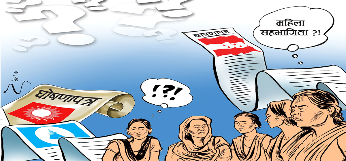 दलका घोषणापत्र पल्टाउँदा महिला शब्द भने प्रशस्त भेटिन्छन् - महिला सशक्तीकरण, महिला अधिकार, महिला सहभागिता। शब्दहरू सुन्दर छन् तर शब्दले पेट भरिँदैन, शब्दले न्याय दिँदैन, शब्दले सम्मान दिँदैन।