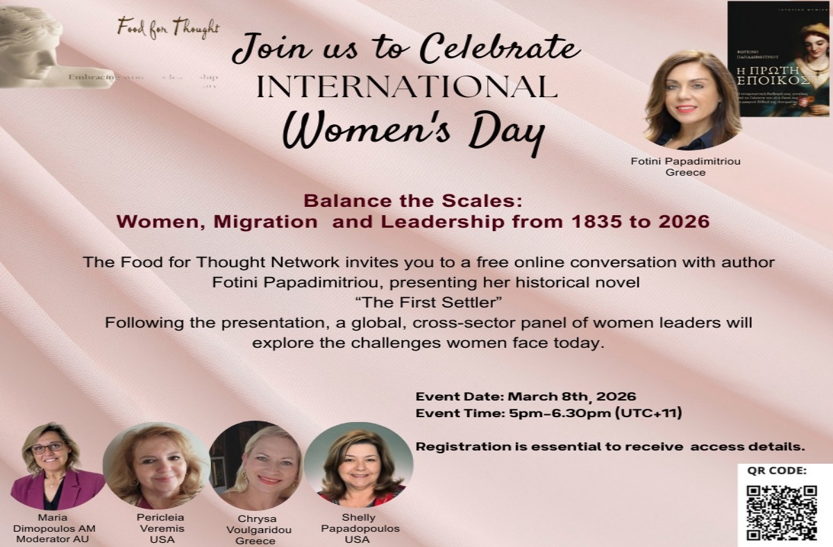 Το Food For Thought Network (FFTN) διοργανώνει μια ξεχωριστή διαδικτυακή εκδήλωση για τη Διεθνή Ημέρα της Γυναίκας, στις 8 Μαρτίου 2026, φέρνοντας κοντά φωνές από όλο τον κόσμο για να εξερευνήσουν την ηγεσία των γυναικών, τη μετανάστευση και την ανθεκτικότητα μέσα από σχεδόν δύο αιώνες ιστορίας. Το φετινό θέμα, «Εξισορροπώντας τη Ζυγαριά: Γυναίκες, Μετανάστευση και ... Περισσότερα www.ertnews.gr