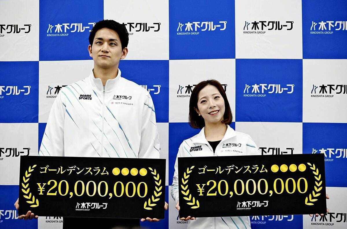 Figure skating gold medalists Riku Miura and Ryuichi Kihara were each awarded a bonus of ¥20 million by Kinoshita Group, the pair’s corporate sponsor.