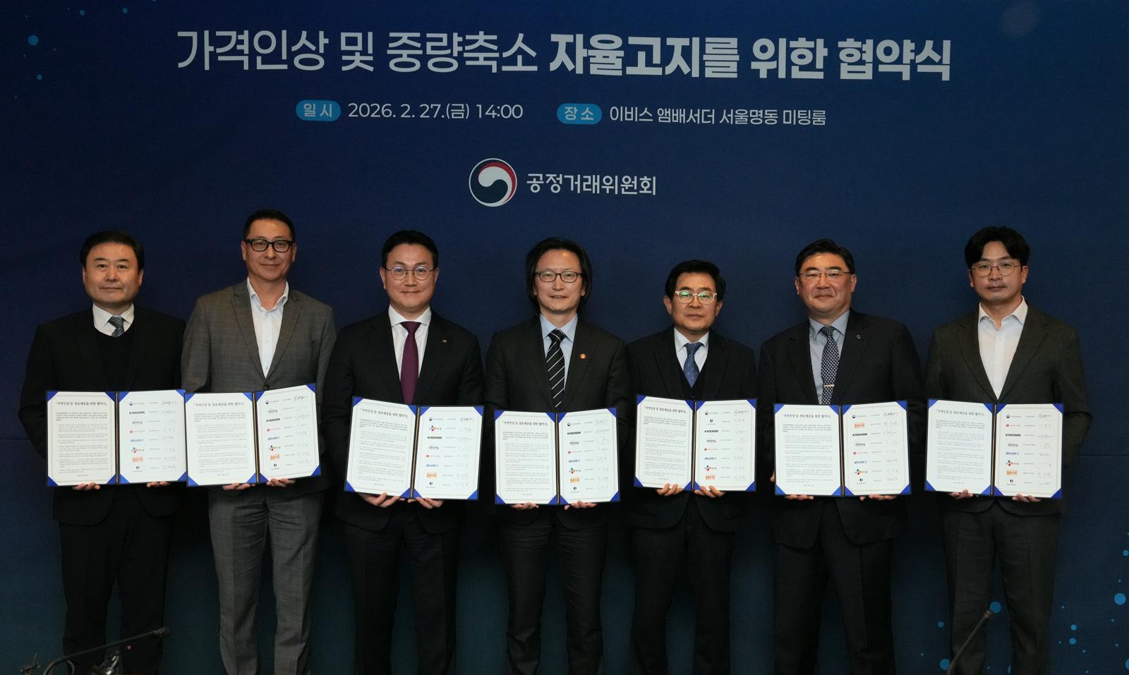 교촌치킨, BHC, BBQ 등 주요 치킨 브랜드를 포함한 7개 외식업체가 상품 가격을 올리기 최소 일주일 전 소비자에게 알리기로 했다.27일 공정거래위원회는 국내 외식업 7개사와 이 같은 내용의 ‘가격인상 등 정보제공 협약’을 체결했다고 밝혔다.이는 지난해 12월 발표된 ‘식품분야 용량꼼수 대응방안’의 후속 조치다. 협약식에는 교촌에프앤비(교촌치킨), 다이닝브랜즈그룹(BHC 등), 롯데지알에스(롯데리아 등), 비알코리아(던킨도너츠 등), 씨제이푸드빌(뚜레쥬르 등), 제너시스비비큐(BBQ), 파리크라상(파리바게뜨 등) 등 7개 사업자가 참여했다.협약 체결사는 외식상품의 가격을 인상하거나 중량을 줄이는 경우 늦어도 일주일 전에는 그 사실을 인터넷 홈페이지, 언론 등을 통해 소비자에게 알리기로 했다. 가격이 변동되는 상품이 여러 개라면 유형별로 평균 인상률 또는 감축률을 안내한다.가맹점에 적용되는 가격을 인상할 때는 사전에 가맹점과 충분히 협의하는 내용도 포함됐다. 또 가맹점이 실제 소비