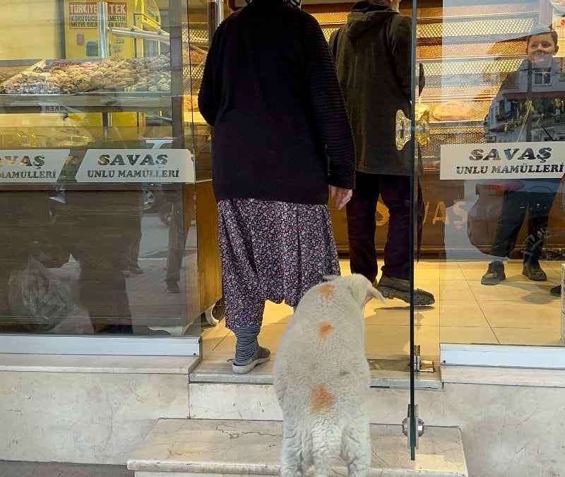 Bursa'da kuzu Çorap, yanından ayrılmadığı sahibi ile pide sırasına giriyor