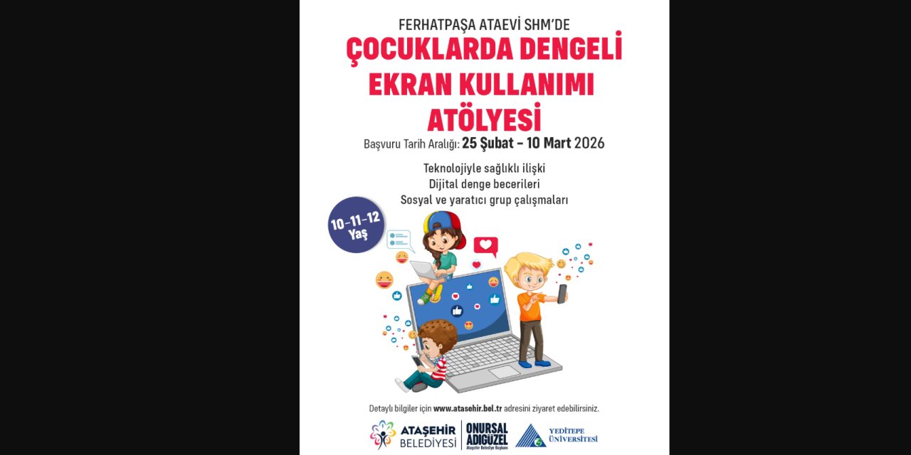 Ataşehir Belediyesi ve Yeditepe Üniversitesi iş birliğiyle düzenlenecek atölye programı sayesinde çocuklara dengeli teknoloji kullanımının önemi aktarılacak. Programla; çocukların ekran sürelerini bilinçli yönetmeleri, sosyal ve fiziksel aktivitelere yönelmeleri ve teknolojiye karşı sağlıklı bir tutum geliştirmeleri hedefleniyor.