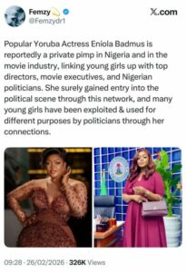 Actress Eniola Badmus, who is now the Special Assistant to Speaker of the Nigerian House of Representatives on Social Events and Public Hearings, has vowed to go after an X-user, @Femzydr1, who claimed she pimps girls to politicians, movie executives and others. The X user today, shared a post making the claim. “Popular Yoruba Actress […]
