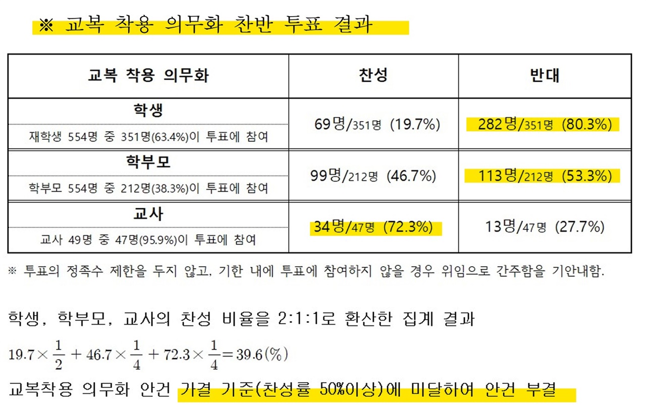 학생들이 잘 입지 않는 값비싼 정장형 교복이 문제로 떠오른 가운데 서울과 충북지역 고등학교에서 추진한 '정장 교복 착용 의무화' 시도가 학생들의 반대로 잇달아 무산된 사실이 확인됐다. 서울 A고, '교복 착용 의무화' 추진했다가 오히려 교복 없애기로 27일 <오마이뉴스>가 지난해 9월 22일 열린 서울 공립 A고 학교운영위 회의록을 살펴보니, 이 학교는 '정장 교복 착용 의무화'를 추진했다가, 오히려 기존에 있던 정장형 교복(생활복 포함)까지 없애기로 했다. 찬반 투표 결과 교사들은 교복 의무화에 72.3%가 찬성했지만(반대 27.7%) 학생들은 찬성률이 19.7%(반대 80.3%)에 그쳤기 때문이다. 학부모 찬성률은 46.7%(반대 53.3%)였다. 이 학교 교장은 <오마이뉴스>에 "학생들의 뜻이 무시되지 않도록 학생, 교사, 학부모 찬성 비율을 각각 2:1:1로 환산해 보니 찬성률이 39.6%였다"라면서 "그래서 교복 착용 의무화 안건을 부결시키는 한편, 그동안 존재했던 교복을 자유복으로 바꿨다"라고 설명했다. "학교 구성원의 민주적 의사 수렴을 거쳐 결정한 것"이라고도 했다. 전체 내용보기