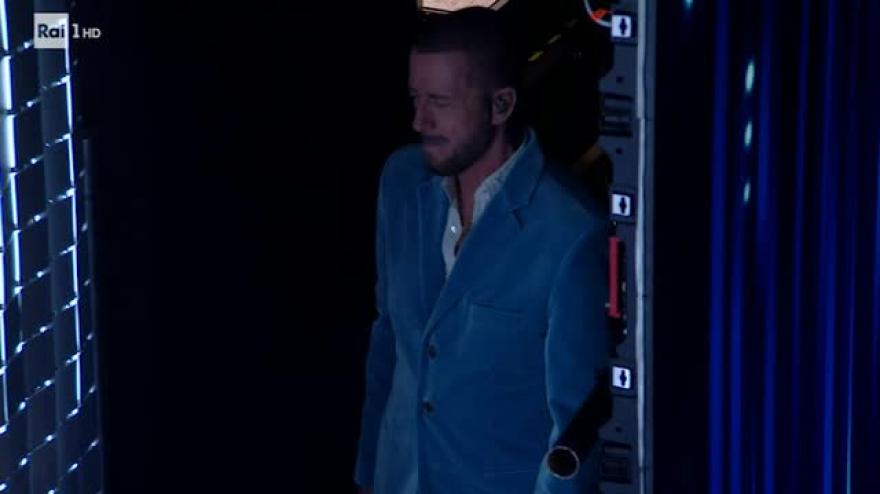 Raf al Festival di Sanremo, durante la terza serata, con "Ora e per sempre". Prima di esibirsi, il cantante immortalato dalle telecamere mentre... si sistema i pantaloni.