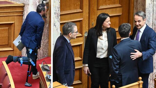 Ο χρονοκόφτης έπιασε Μητσοτάκη και Ανδρουλάκη στη Βουλή και ο Παρασύρης, που ήρθε με νάρθηκα στην Ώρα του Πρωθυπουργού