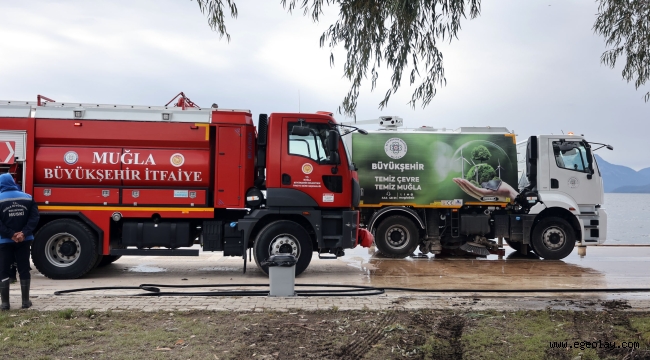 EGEOLAY/Köyceğiz’de 27 Şubat’ta etkili olan yoğun yağışların ardından Köyceğiz Gölü taştı. Taşkın sonrası Muğla Büyükşehir Belediyesi ekipleri bölgede temizlik çalışmalarını sürdürüyor.