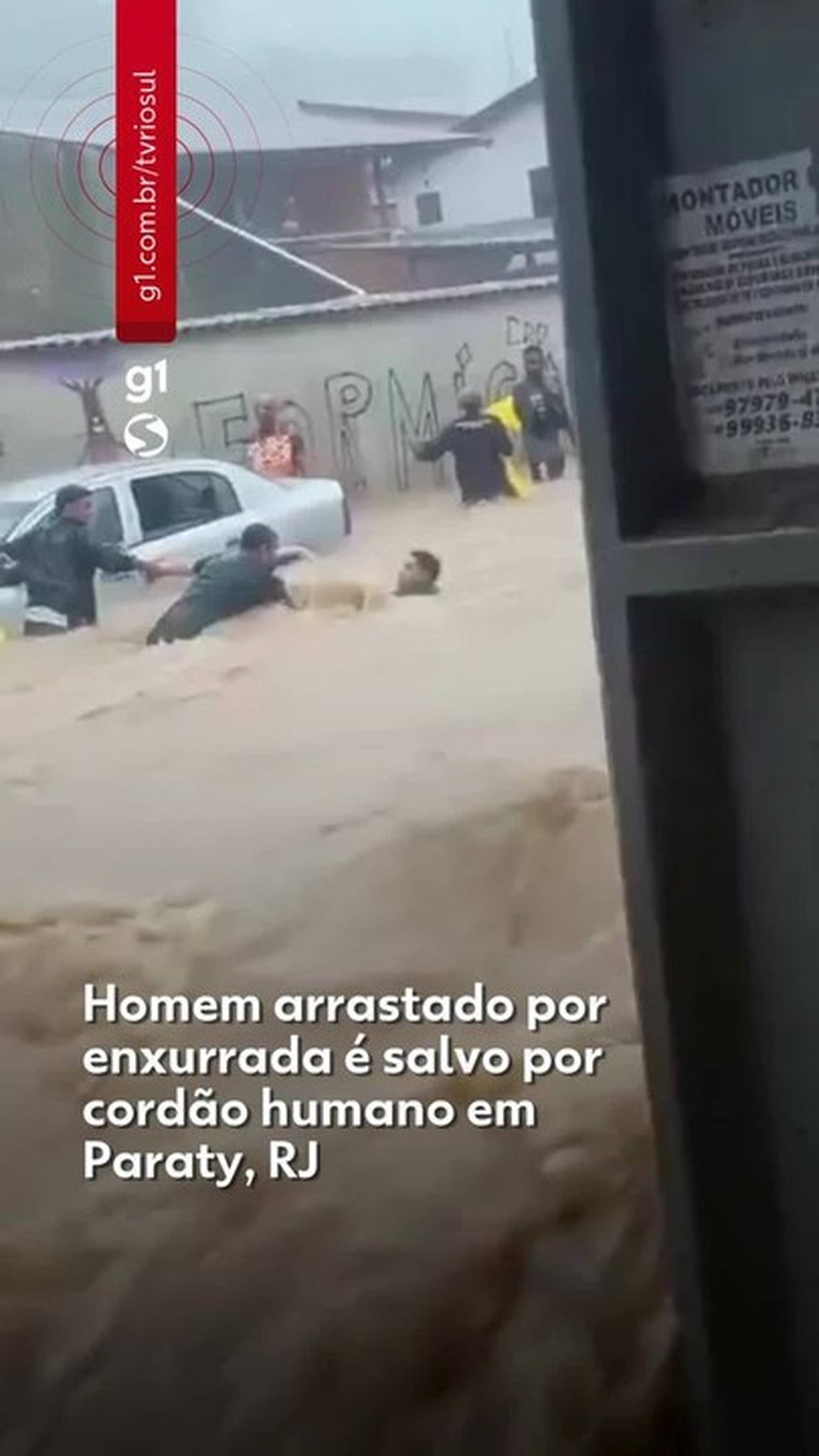 Homem arrastado por enxurrada é salvo por cordão humano em Paraty, RJ Um homem foi arrastado pela correnteza durante a forte chuva na noite de quinta-feira (26), em Paraty (RJ). O caso aconteceu no bairro Condado, depois do acumulado de 226 milímetros registrados em 24h. Em um vídeo que circula nas redes sociais, é possível ver o rapaz sendo levado pela enxurrada. Ele foi salvo por um cordão humano de três homens se segurando para alcançá-lo. Na sequência, todos se apoiam na frente de um carro para não serem levados também pela correnteza. Segundo a prefeitura, até a última atualização, as áreas mais afetadas foram os bairros Condado, Campinho, Patrimônio, Vila Dom Pedro, Parque da Mangueira, Chácara, Patitiba, Morro do Jacú, Pantanal, Ilha das Cobras, Caborê, Jabaquara, Várzea do Corumbê, Trindade, Corisco, Canto Verde, Canto Azul, Novo Horizonte e Paraty Mirim, além de trechos da Rodovia BR-101 e da Rodovia RJ-165 (Paraty-Cunha). Além disso, todo o município registrou ocorrências relacionadas ao temporal. ✅Clique aqui e entre no canal do g1 no WhatsApp Até a publicação desta reportagem, o homem não tinha sido identificado. VÍDEOS: as notícias que foram ao ar na TV Rio Sul
