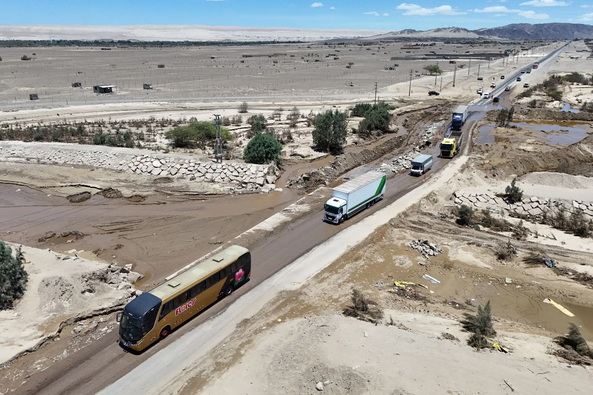 El tránsito de vehículos livianos, de pasajeros y de carga pesada se ha normalizado de forma lenta pero segura en el kilómetro 337 de la carretera Panamericana Sur, en el distrito de Ocucaje en la provincia y región Ica, zona que durante una semana soportó constantes interrupciones debido a la caída de huaicos.