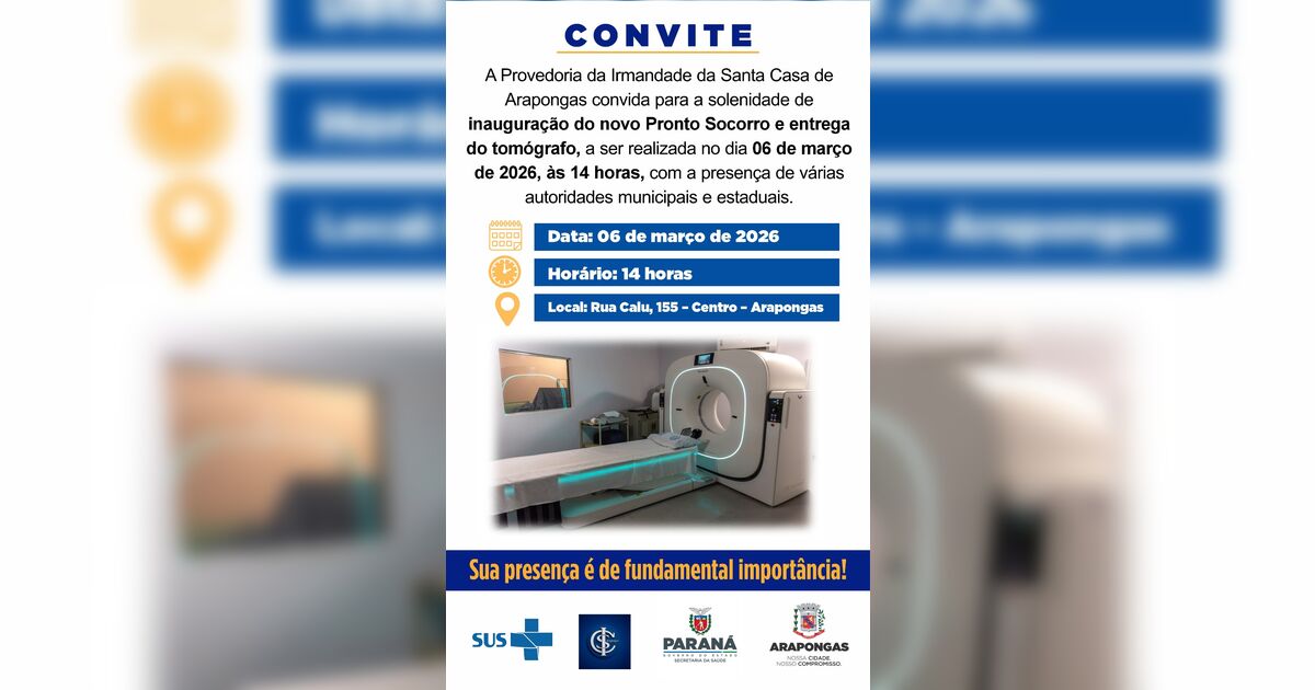 Irmandade da Santa Casa de Arapongas inaugura, nesta sexta-feira (06), às 14h, as novas instalações de seu pronto-socorro e oficializa a entrega de um tomógrafo de última geração. O evento, que cont...