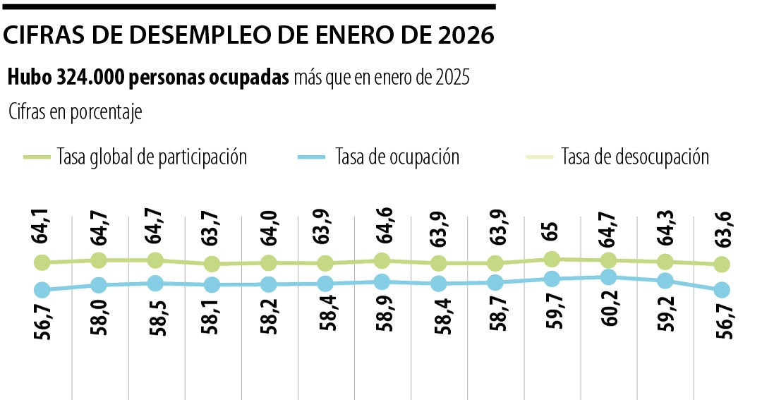 En enero de 2026, la Tasa Global de Participación se ubicó en 63,6%, mientras que la Tasa de Ocupación fue de 56,7%, prácticamente similar a la registrada un año atrá