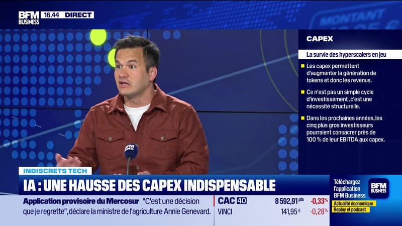 Ce vendredi 27 février, Alexandre Laing, partner chez Carré Partners, David Rainville, responsable stratégie Tech chez Sycomore AM, et Gilles Santacreu, trader algorithmique et administrateur du site Boursikoter.com, , se sont penchés sur les résultats de Nvidia dépassant les attentes du marché, les effectifs réduits par l'IA de Block, le virage vers une stratégie de l'IA de Duolingo, l'enjeu de souveraineté de l'IA, la croissance des tokens générés par les datacenters, l'introduction en bourse à venir de Databricks, et les résultats de Worday face à l'IA, dans l'émission BFM Bourse présentée par Antoine Larigaudrie. BFM Bourse est à voir ou écouter du lundi au vendredi sur BFM Business.