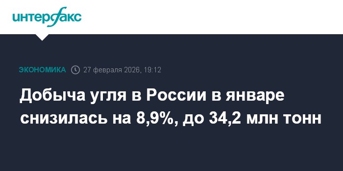 В России в январе 2026 года добыча угля снизилась на 8,9% в годовом исчислении, до 34,2 млн тонн, сообщил Росстат.
