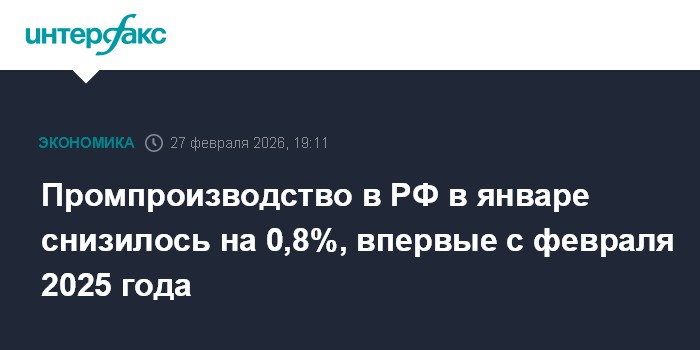 Промпроизводство в РФ в январе 2026 года снизилось на 0,8% в годовом сравнении, сообщил в пятницу Росстат.