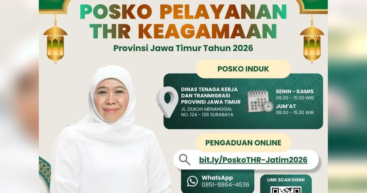 Pemerintah Provinsi Jawa Timur resmi membuka 54 Posko THR 2026 di seluruh kabupaten/kota, memastikan tunjangan hari raya keagamaan pekerja terpenuhi tepat waktu dan mendorong perputaran ekonomi jelang Idul Fitri 1447 H.