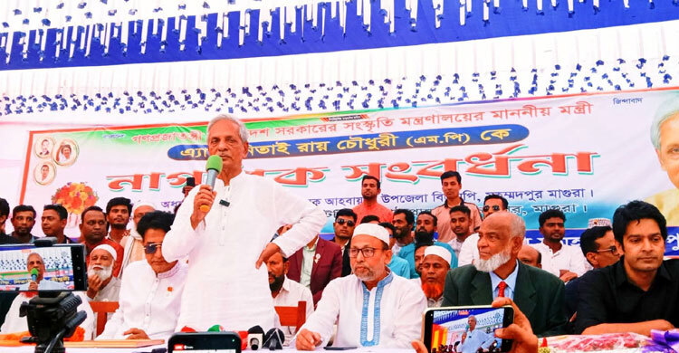 সংস্কৃতি বিষয়ক মন্ত্রণালয়ের দ্বায়িত্ব পাওয়ায় বিএনপির কেন্দ্রীয় কমিটির ভাইস চেয়ারম্যান অ্যাড. নিতাই রায় চৌধুরী মাগুরার মহম্মদপুরে নাগরিক সংবর্ধনা দেওয়া হয়েছে। শুক্রবার (২৭ ফেব্রুয়ারি) বিকেলে উপজেলার সরকারি আর. এস. কে. এইচ ইনস্টিটিউশন মডেল মাধ্যমিক বিদ্যালয় প্রাঙ্গণে সংস্কৃতিমন্ত্রী নিতাই রায় চৌধুরী এমপিকে এ নাগরিক সংবর্ধনা দেওয়া হয়। মহম্মদপুর উপজেলা বিএনপি, অঙ্গ ও সহযোগী সংগঠন এই সংবর্ধনার আয়োজন করে। সংবর্ধনা অনুষ্ঠানের সভাপতিত্ব করেন উপজেলা বিএনপির সাবেক আহ্বায়ক অধ্যক্ষ মৈমূর আলী মৃধা। এসময় উপস্থিত ছিলেন মাগুরা-১ আসনের সংসদ সদস্য মো. মনোয়ার হোসেন খাঁন, জেলা বিএনপির যুগ্ম আহ্বায়ক অ্যাড. খাঁন রোকনুজ্জামান, উপজেলা মুক্তিযোদ্ধা কমান্ড কাউন্সিল আহ্বায়ক অধ্যক্ষ (অব.) মোহাম্মদ মতিউর রহমান, জেলা বিএনপির যুগ্ম আহবায়ক অ্যাড. মিথুন রায় চৌধুরী। বক্তেবে নিতাই রায় চৌধুরীক বলেন, বেকার সমস্যা সমাধানই সরকারের অন্যতম লক্ষ্য। মাগুরাকে উৎপাদনমুখী জেলায় রূপান্তর করতে উদ্যোগ নেওয়া হবে, যাতে শিক্ষিত ও অর্ধশিক্ষিত তরুণরা আত্মকর্মসংস্থানের সুযোগ পায়। তিনি আরও জানান, জেলার ওপর দিয়ে বয়ে যাওয়া কুমার, ফটকি ও চিত্রা নদী খননের পরিকল্পনাও রয়েছে। পাশাপাশি শিল্প কারখানা গড়ে তোলার পরিবেশ সৃষ্টি করে মাগুরার সার্বিক উন্নয়নে কাজ করার আশ্বাস দেন তিনি। মো. মিনারুল ইসলাম জুয়েল/এনএইচআর