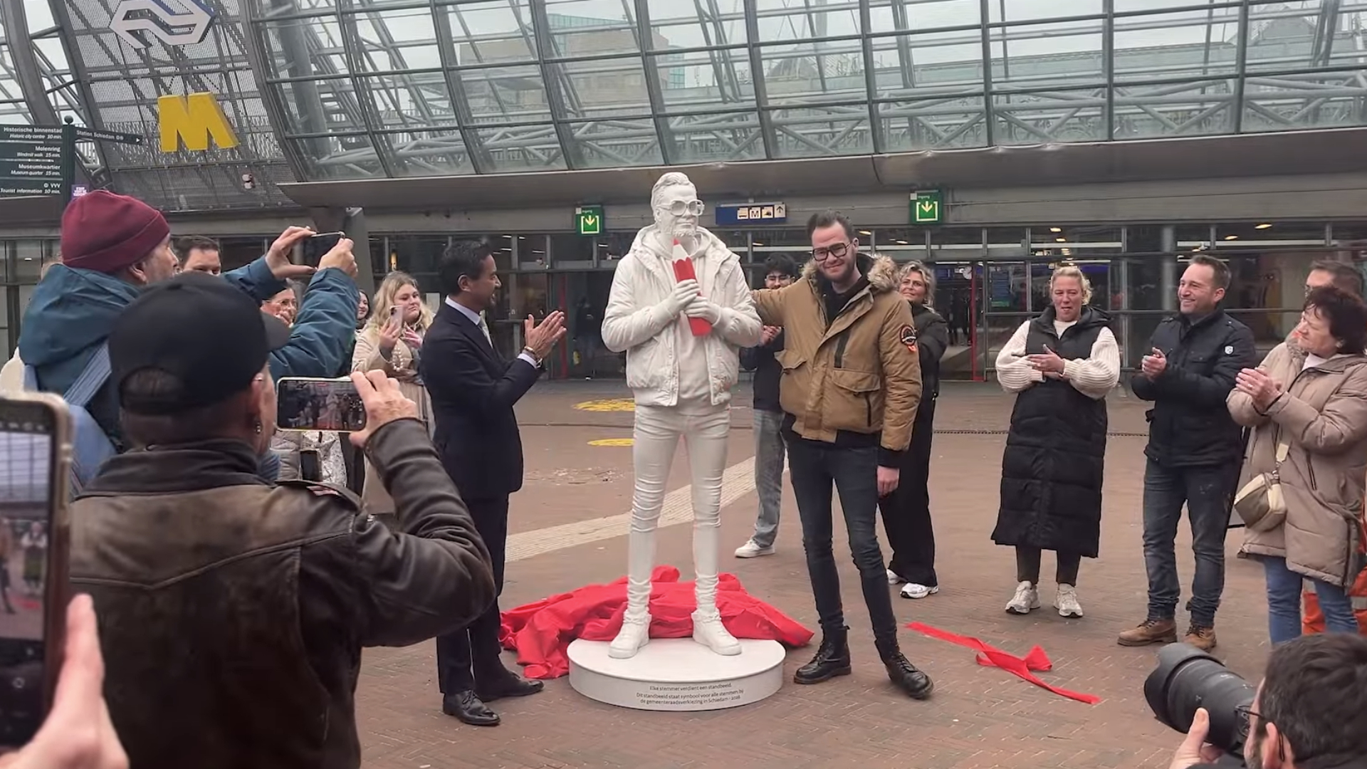 Een levensgroot standbeeld van de 33-jarige Nick Grobbe trekt veel bekijks op het plein voor station Schiedam Centrum. Nick is Schiedammer, werkt in de horeca en gaat op 18 maart stemmen. Met zijn standbeeld staat hij symbool voor 'de gewone stemmer'.