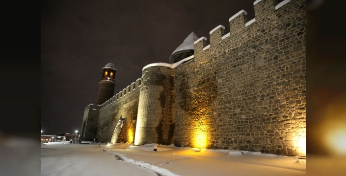 Erzurum'da etkili olan yoğun kar yağışının ardından tarihi yapılar beyaz örtüyle kaplandı. Dronla yapılan görüntülemelerle şehirdeki manzara gözler önüne serildi.