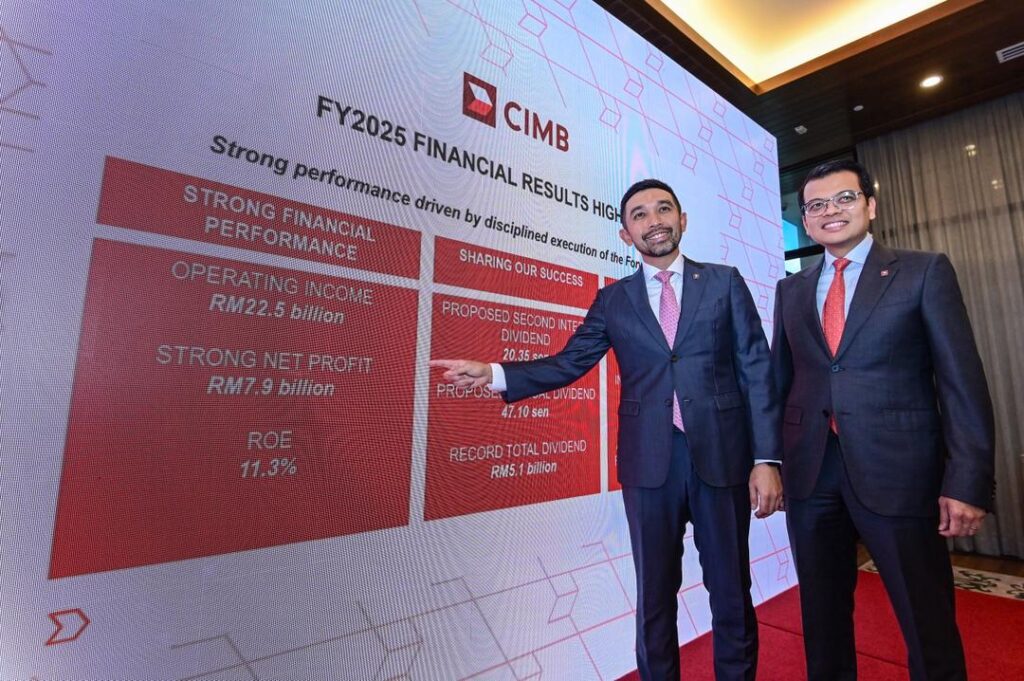 PETALING JAYA: CIMB Group Holdings Berhad (CIMB Group) mencatat keuntungan bersih bernilaiRM7.9 bilion bagi tahun kewangan berakhir 31 Disember 2025, meningkat 1.7 peratus berbanding RM7.7 bilion pada tahun sebelumnya. Keuntungan sebelum cukai (PBT) meningkat 2.7 peratus tahun ke tahun kepada RM10.7 bilion, bersamaan pendapatan sesaham (EPS) sebanyak 73.1 sen. Sejajar dengan prestasi kewangan kukuh itu, ... Read more The post CIMB Group catat untung bersih RM7.9 bilion pada 2025 appeared first on Utusan Malaysia .