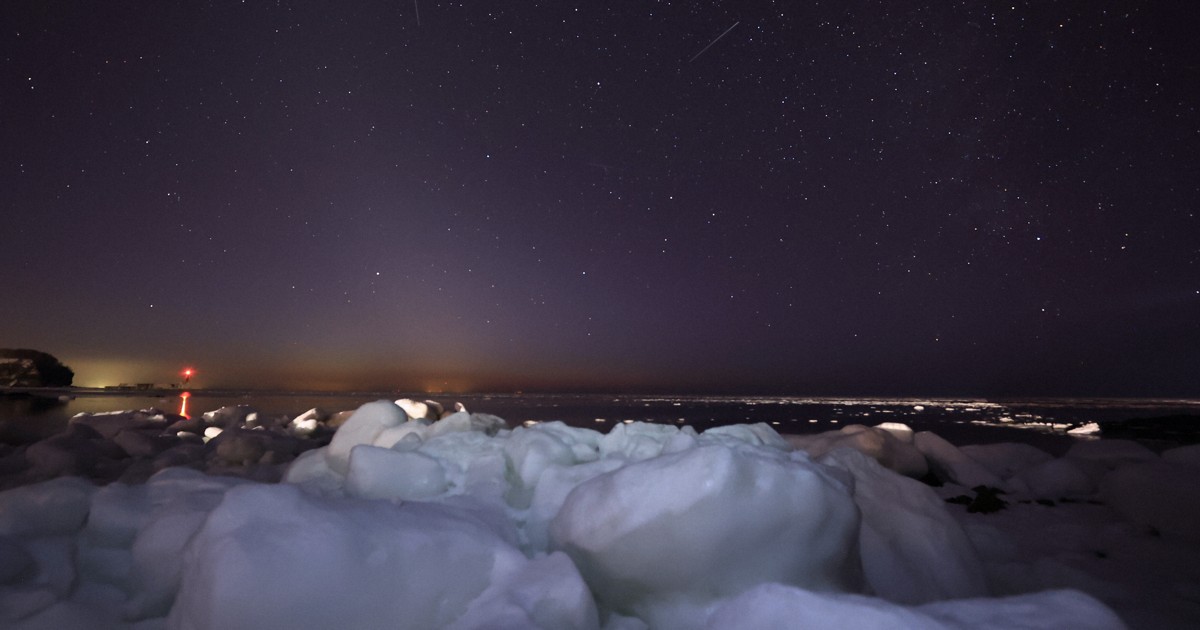 北海道・ウトロに打ち上がる流氷 暗色の岩場ともし春を待つ