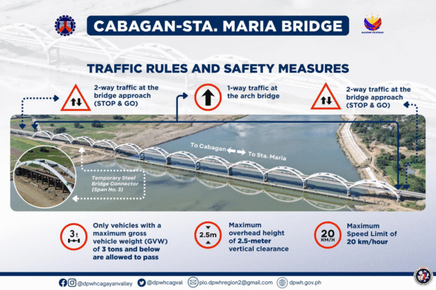 MANILA, Philippines — The Cabagan-Sta. Maria Bridge in Isabela will be reopened to motorists on Monday, March 2, over a year after one of its segments collapsed due to overloading. The Department of Public Works and Highways (DPWH) Cagayan Valley on Friday said that “vehicles with up to 3 tons gross vehicle weight (GVW) and 2.5 meters overhead height” would be allowed to pass through the bridge. The DPWH Cagayan Valley said the local government units of Cabagan and Sta. Maria and the first district engineering office of DPWH Isabela will implement 24/7 traffic management. Plastic barriers will be installed […]... Keep on reading: DPWH: Collapsed Isabela bridge to reopen to motorists on March 2