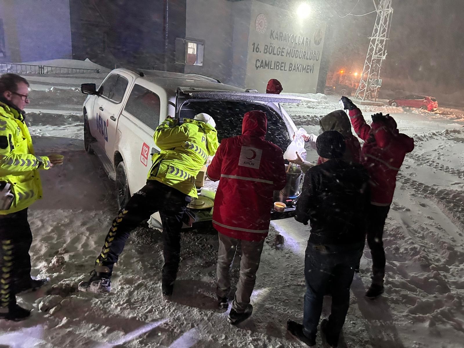 Tokat’ta etkili olan yoğun kar yağışı, Tokat-Sivas Karayolu Çamlıbel mevkiinde ulaşımı aksattı. Rampalarda ilerleyemeyen tırlar uzun kuyruklar oluştururken, mahsur kalan sürücülere Türk Kızılay ve AFAD ekipleri gece boyunca sıcak yemek desteği sağladı.