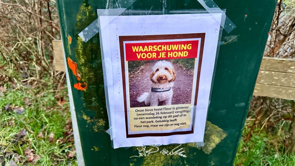 In en rond het Broersepark in Amstelveen zijn meerdere honden vergiftigd nadat ze daar iets hebben gegeten. Een hond zou zelfs overleden zijn. Hondeneigenaren waarschuwen elkaar daarom om goed op te letten. Zo heeft het baasje van Fleur bij vrijwel alle ingangen van het park een affiche met een foto van haar hond gehangen. Het park oogt vrijdagavond erg rustig. Niets wijst erop dat er iets aan de hand is. Maar wie voorbij een willekeurige ingang op de prullenbak voor hondenpoep kijkt, ziet een affiche met daarop een treurig ogende labradoodle terugkijken. 'Onze lieve hond Fleur is gisteren (woensdag 26 februari) vergiftigd na een wandeling op dit pad of in het park. Gelukkig leeft ze nog, maar we zijn er nog niet', zo valt er onder de foto te lezen. Het baasje van Fleur probeert daarmee de andere hondeneigenaren te waarschuwen. Maar haar verhaal lijkt niet op zichzelf te staan. Hond aan het infuus Zo wordt op het sociale medium NextDoor door een andere hondeneigenaar gezegd dat haar hond afgelopen dinsdag is opgenomen met bloederige diarree. "Ze ligt aan het infuus en het is nu afwachten of ze het redt." Ook haar hond zou iets giftigs hebben gegeten, waarschijnlijk op het Zwarte Pad of Egelpad. Een hond zou er zelfs aan zijn overleden. Hoeveel honden er in totaal iets giftigs hebben gegeten, is onduidelijk. Volgens een voorbijganger zou het om rattengif gaan. Tekst gaat door onder de foto. Intussen gaat het verhaal als een lopend vuurtje door de buurt. Hondeneigenaren die in de omgeving wonen, vertellen dat ze het verhaal op sociale media of buurtapps voorbij zagen komen. Hond voorlopig aangelijnd Hele grote zorgen zeggen de buurtbewoners niet te hebben. Maar toch letten ze nu wat beter op of houden ze hun hond voorlopig aangelijnd. Inmiddels wordt de kwestie ook in de lokale politiek opgepakt. Zo hebben de VVD en Goed voor Amstelveen schriftelijke vragen aan het college gesteld, zo schrijft Amstelveenz.