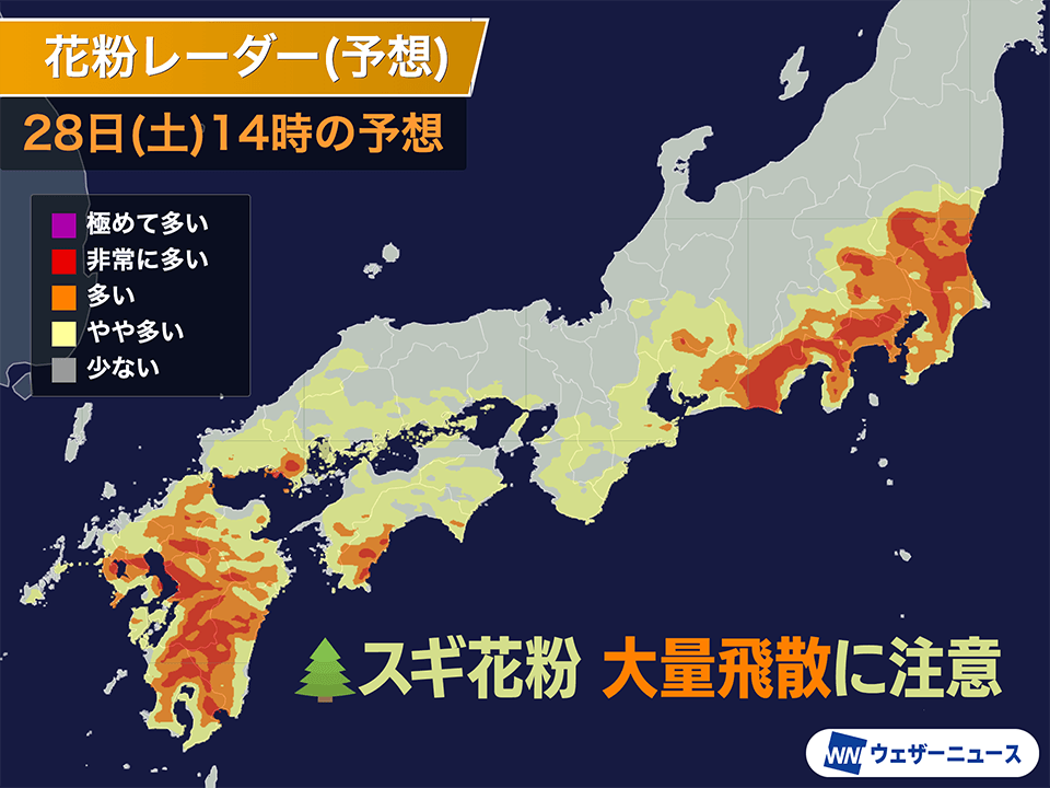 2026-02-28 07:20 ウェザーニュース 今日2月28日(土)は気温上昇と北風の強まりにより、関東以西の太平洋側でスギ花粉が飛びやすい気象条件となる見込みです。大量飛散となる可能性があるため、しっかりと花粉症対策を行ってください。 ウェザーニュース 花粉観測状況・飛散予想 関東では風向き、西日本は“雨上がり”も飛散に好条件 今日は太平洋で発達する低気圧と大陸の高気圧との間で気圧の傾きが大きくなり、全国的に北寄りの風が強まる見込みです。また、全国的に気温は高めで、特に関東では4月並みの暖かさが予想されています。 強風と気温の上昇により花粉が飛散しやすくなることや、関東や東海では杉の木が多い山沿いから平野部に向かって吹く風向きになるため、多くの花粉が平野部で飛散するとみられます。 また、九州や四国では雨上がりであることも、花粉の飛散に拍車をかける見込みです。 風レーダー レーダー 花粉モードをアプリで見る 花粉飛散予想をみると、九州の内陸部で「多い」や「非常に多い」ランクに達する所が多くなっています。関東や静岡県も広範囲で「多い」ランクで、一部の地域では「非常に多い」予想です。 お出かけを予定されている場合は、服薬やマスクなどでしっかりと花粉対策を行うようにしてください。また、帰宅時に家の中へ花粉を持ち込まないよう注意が必要です。 ピンポイント花粉飛散状況・予想 【関連記事】 週間天気予報 3月3日の月食は雨が心配 3〜4日おきに低気圧が接近 花粉対策の盲点 衣類以上に花粉が付着している場所とは ひな祭りは広い範囲で雨に 低気圧の動向に注意 北海道で湿った重たい雪に 路面状態の悪化に注意 魔のサークル「花粉光環」が出現 関東などでスギ花粉が大量飛散 ...クリックして全文を読む